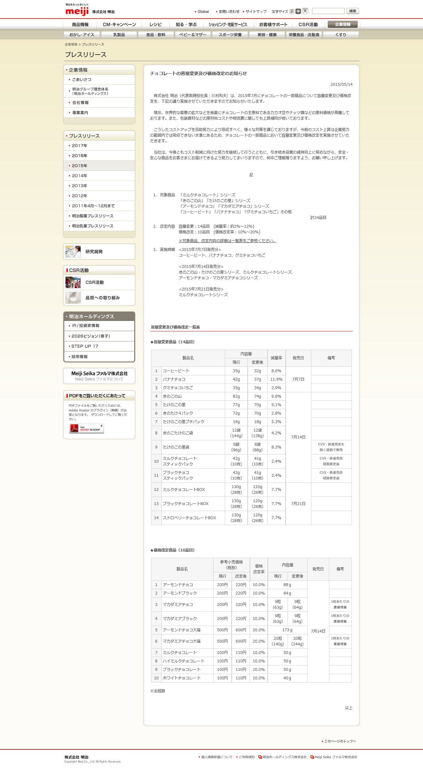 | 2015年 | 50g | 110円(税別) | カカオ豆やナッツ類などの原料価格が高騰。 |